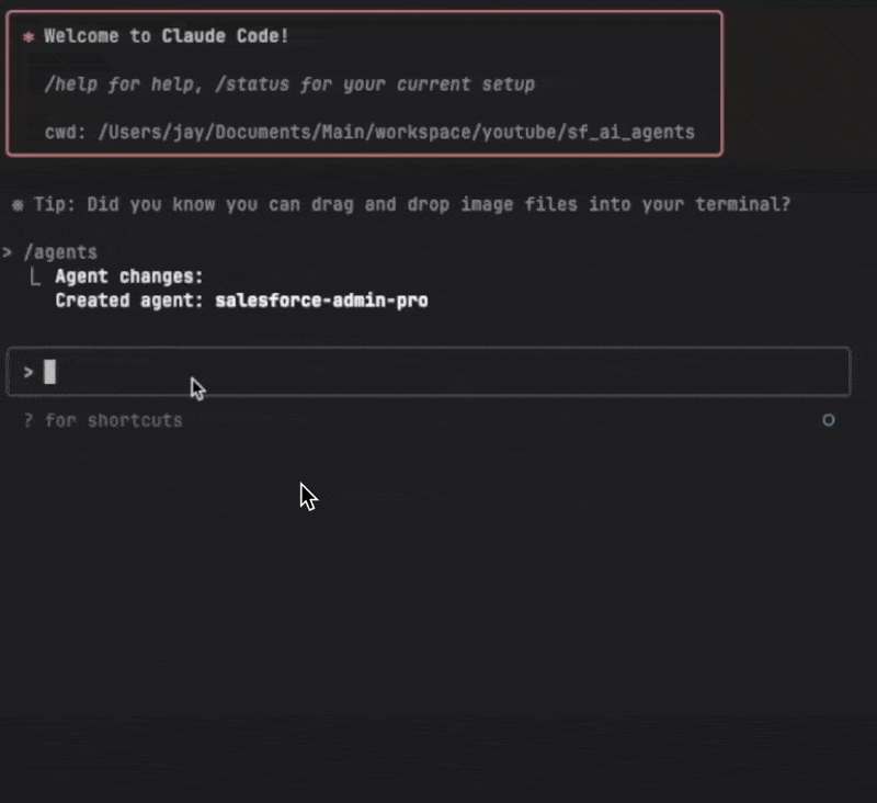 The first step is creating a specialized sub-agent that understands Salesforce. Here are the actual steps I used in Claude Code:
