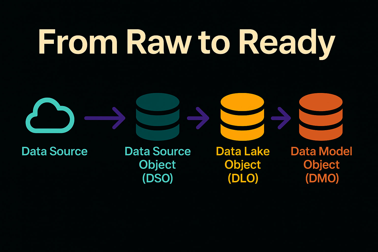 Think of it like cooking: raw ingredients (your incoming data) are first gathered and set aside (DSO, like a prep station), then cleaned and chopped (DLO, like prep work in the kitchen), and finally plated as the finished dish (DMO, the ready-to-serve meal). In Data Cloud terms, DSOs hold raw ingested data, DLOs store transformed and structured data, and DMOs provide a unified, virtual view of that data for use in analytics, identity resolution, and insights. Let’s explore each of these in detail, step by step.