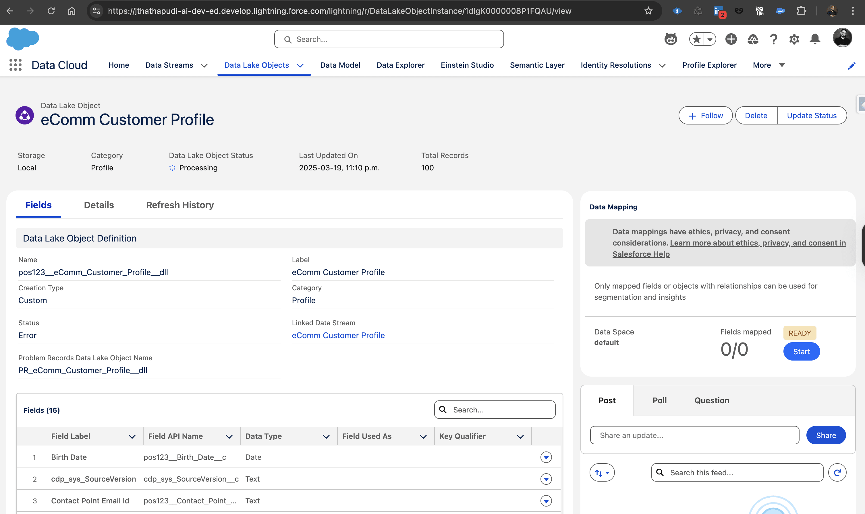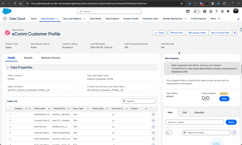 The DSO is important because it provides a reliable snapshot of the raw source data inside Data Cloud. If something looks wrong later in the process, you can always check the DSO to verify what was originally ingested. However, you typically won’t query or segment on the DSO itself. It’s a back-end staging layer. Once data is in a DSO, you’ll map and refine it into a more usable form – the Data Lake Object, which is the next stage.