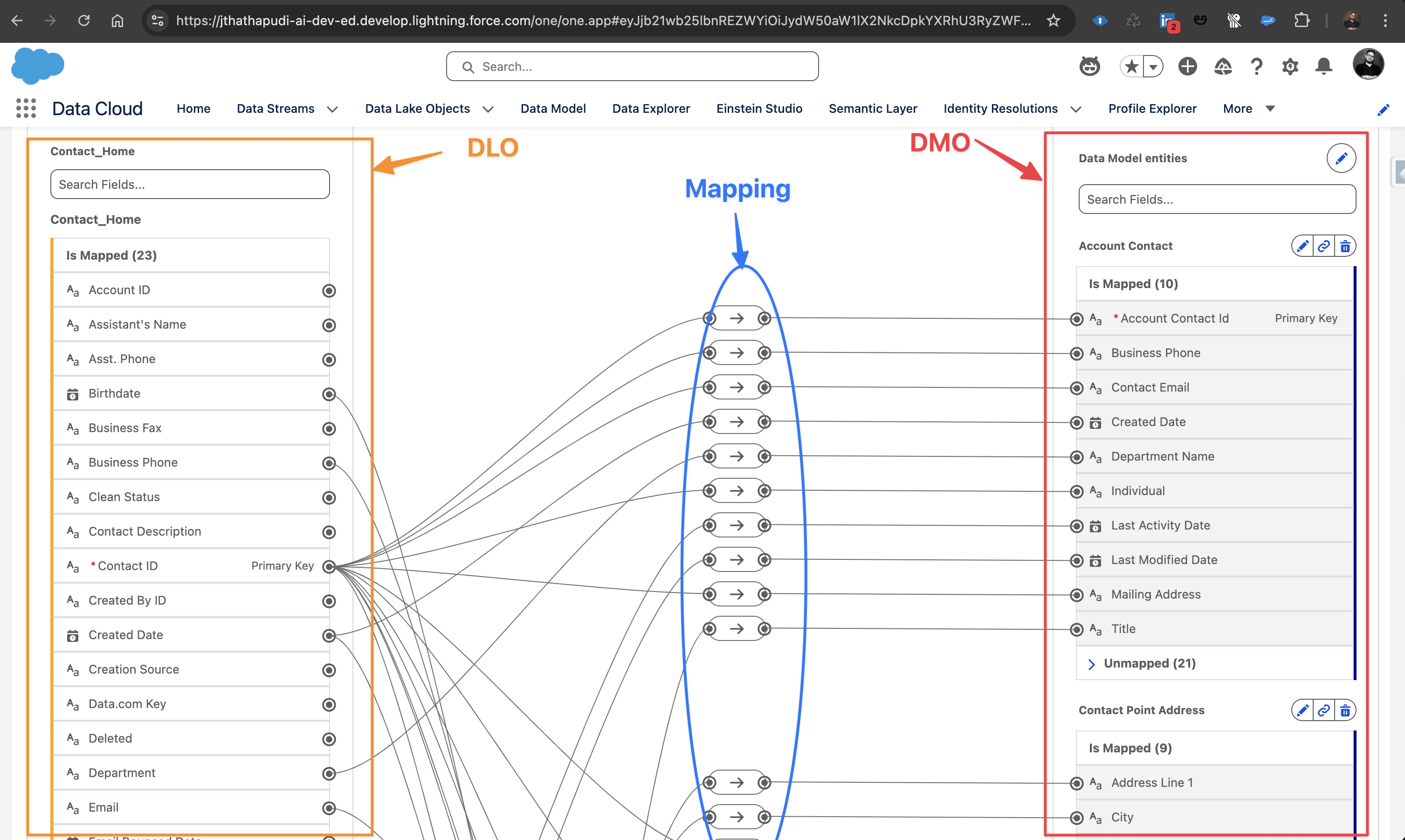 In practice, you will map each DLO to an appropriate DMO. Often, multiple DLOs feed into one DMO to create a unified view. This is how Data Cloud unifies data. For example, you might have two different DLOs for customer information – one from your website sign-ups and one from your in-store loyalty system. Both can be mapped into the standard “Individual” DMO (a Profile DMO for people). The Individual DMO will then provide a consolidated view of each person across both sources. If the same person appears in both datasets, Data Cloud can use identity resolution rules to merge those records into one unified profile. In other words, instead of two separate records for the same person, you get a single customer profile in the Individual DMO that combines attributes from both sources.